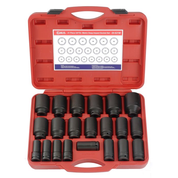 ●JUEGO DE DADOS DE IMPACTO PROFUNDO MÉTRICOS – Juego de dados de impacto profundo Dr. Métricos de 3/4″ de 21 piezas (CR-Mo) DI-621M
