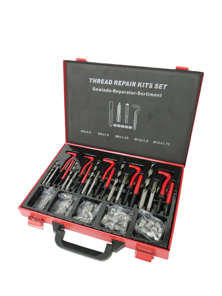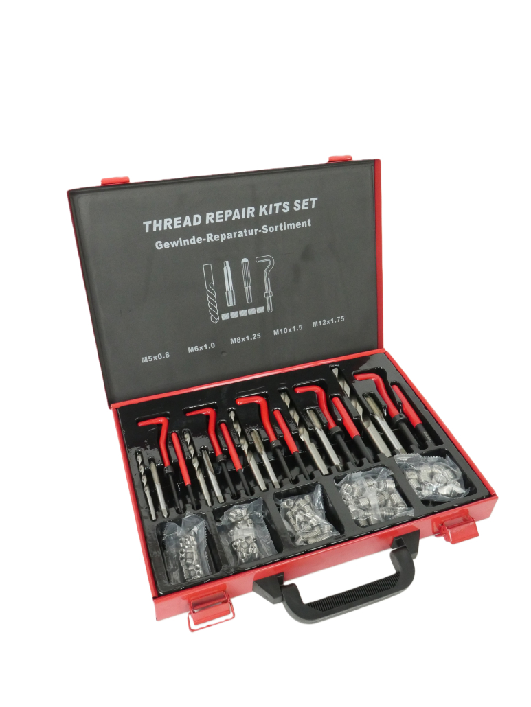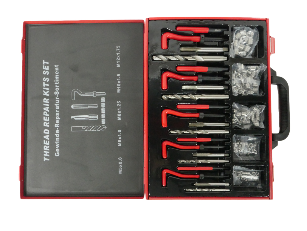 Incluye todo lo necesario para la reparación: brocas especiales, machuelos (machos de roscar), herramienta instaladora de insertos y herramienta para romper la lengüeta del inserto.