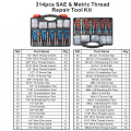 Juego reparador de roscas, 314 pcs medida milimetrica y pulgada cantidad